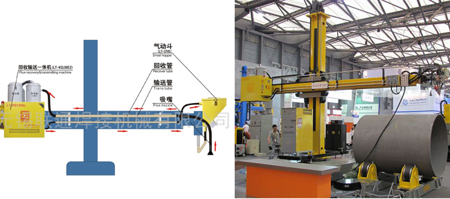 ★This is an integrated equipment for flux recovery and transportation. It is applicable for welding manipulator and all kinds of difficult cross-submerged arc welding equipment. It adopts imported fans to make recovery; it connects with external pressure plastic gas source (0.6Mpa) to feeding; it has level detection, the upper and lower double-valve switching, high-density film filter dust and according to the different needs of welding to replace with different fluxes. The whole action is controlled by the PLC, it will make automatic completion of the recycling flux and can also control recovery, conveying and cutting by an external wired remote control. The effective flux recovery rate is of 95%.